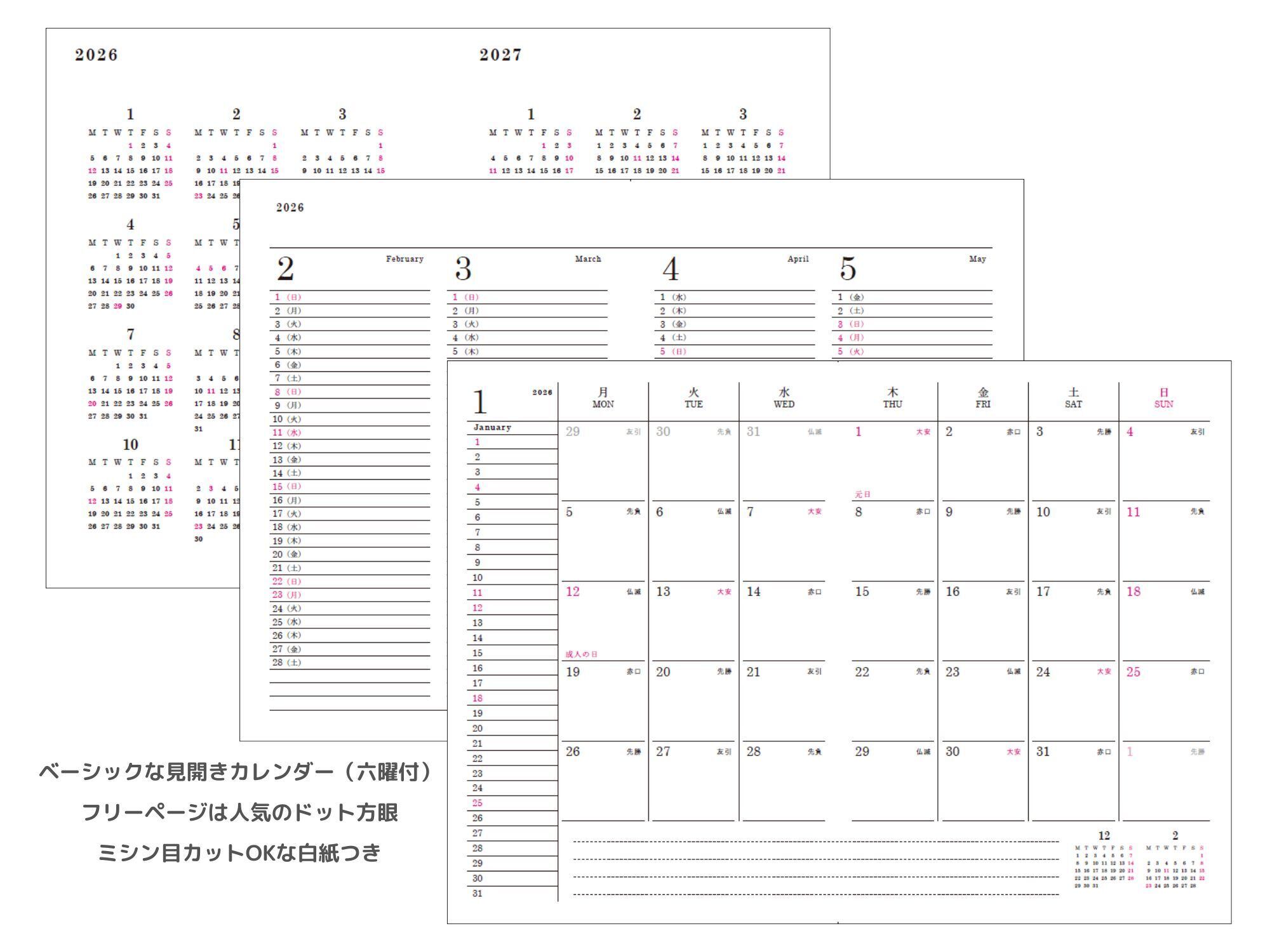 ページ数:192ページ(見開きカレンダー43P、ドット方眼133P、ミシン目入り白紙16P)